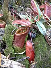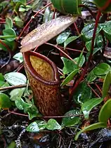 Rosette and lower pitchers are typically ovate in the basal half of the pitcher cup, becoming cylindrical and sometimes slightly infundibular above. A conspicuous hip often delimits these two parts of the trap. Terrestrial pitchers may also be entirely ovate. They are relatively small, rarely exceeding 7 cm in height by 3 cm in width, although they occasionally reach 12 cm by 4 cm. A pair of wings (≤8 mm wide)[8] runs down the ventral surface of the pitcher cup. The wings bear fringe elements up to 5 mm long. The pitcher mouth is suborbicular and has an oblique insertion.[8] The peristome is cylindrical and becomes flattened and broader towards the sides and rear, measuring up to 7 mm in width. It bears ribs up to 0.5 mm high and spaced up to 0.8 mm apart. On the inner margin of the peristome, the ribs terminate in teeth up 1 mm long. The pitcher lid or operculum is orbicular[8] to elliptic[5] with a rounded apex and a rounded to cordate base.[8] It bears no appendages, although the midline may be thickened into a 1 mm high ridge.[8] It reaches 4.5 cm in length by 3.8 cm in width. The lower surface of the lid bears numerous nectar glands. Most are orbicular and measure 0.1–0.2 mm in diameter; this type occurs at a density of 1500–2000/cm2.[8] Larger, longitudinally elliptic glands of 0.4 mm, and occasionally even up to 3 mm, are concentrated around the midline.[8] An unbranched spur measuring up to 5 mm in length is inserted near the base of the lid. It may or may not be flattened.[8] Lower pitchers are typically reddish on their outer surface, often having speckles of a darker red colour. The inner surface varies from white to light orange. The peristome may be orange, through red, to purple. The lid is often yellowish on its lower surface and the same colour as the pitcher cup on its upper surface. Stunted plants from higher altitudes typically produce dark terrestrial pitchers.[5]
