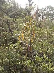 Leaves are thinly coriaceous and sessile.[8] The lamina (leaf blade) is most commonly linear, but may also be lanceolate. It reaches 22 cm in length by 5 cm in width. It has an acute to acuminate apex and an obtuse base that may be decurrent for more than 2 cm down the stem, although it is variable in this respect. Three to four longitudinal veins are typically present on either side of the midrib, restricted to the distal quarter to third of the lamina, although they may number as many as 5 or as few as 0.[8] Pinnate veins, which may or may not be distinct, emerge obliquely from the midrib to form an irregular network in the distal half of the lamina.[8] Tendrils may be densely glandular in some specimens.[8] Laminae are typically green throughout, but may be tinged with purple, especially in stunted plants from higher elevations. The midrib and tendrils are often yellow and turn orange to red upon exposure to strong sunlight.[5]