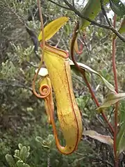 Upper pitchers are infundibular and somewhat inflated in the basal quarter to third of the pitcher cup, becoming cylindrical or slightly infundibular above. A conspicuous hip often delimits these two parts of the trap. Rarely they may be wholly obovoid.[8] Aerial traps are considerably larger than their terrestrial counterparts, growing to 18 cm in height by 5 cm in width. Ribs are present in place of wings. The peristome is cylindrical and up to 5 mm wide, being either uniformly broad throughout or slightly expanded at the sides and rear. Other parts are similar to those found in terrestrial traps. Aerial pitchers are usually yellowish throughout, occasionally with tinges of orange or red in older specimens. The ventral ridges are sometimes completely red. The inner surface may be white to cream coloured. The peristome ranges in colour from yellow to red, whereas the lid is most commonly yellow throughout.[5]