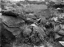 Nepenthes lamii growing with a yellow Rhododendron on Doorman Top, photographed by Herman Johannes Lam in 1920