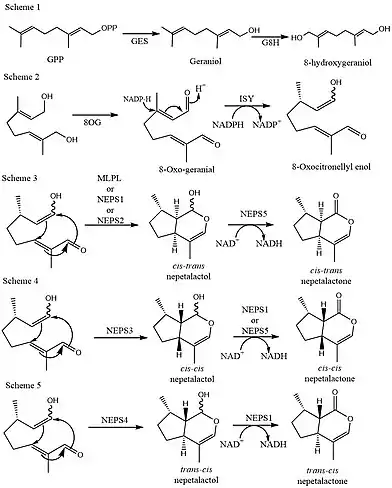 The process starts with geraniol synthase (GES) hydrolyzing GPP to form geraniol which is oxidized into 8-hydrogeraniol by geraniol-8-hydroxylase (G8H) (scheme 1).[12] Geraniol-8-hydroxylase is further oxidized by 8-hydroxygeraniol oxidoreductase (8OG) to produce 8-oxo-geranial which is reduced by iridoid synthase (ISY) and NADPH to form the intermediate 8-oxocitronellyl enol (scheme 2). This intermediate leads to cyclization by a gene cluster which utilizes ISY and major latex-protein-like genes (MLPL) or NEPS homologs.[1] 8-oxocitronellyl enol is cyclized into (cis,trans)-nepetalactol by MLPL, NEPS1, or NEPS2 and then oxidized by NEPS5 and the cofactor NAD+ to yield (cis,trans)-nepetalactone (scheme 3). The process can be repeated with 8-oxocitronellyl enol cyclizing into (cis,cis)-nepetalactol by NEPS3 and oxidation by NEPS1 or NEPS5 and NAD+ to yield (cis,cis)-nepetalactone (scheme 4). 8-Oxocitronellyl enol can also be cyclized into (trans,cis)-nepetalactol by NEPS4 and then oxidized by NEPS1 into (trans,cis)-nepetalactone (scheme 5). It is suggested that the lack of the NEPS1 leads to decay and formation of (trans,cis)-iridodial.[1]