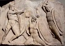The larger and lower frieze on the podium was made up of 22 blocks, of which seven are lost apart from fragments. The surviving panels represent heroic battle scenes, with no apparent overall narrative, mostly involving male soldiers dressed in Greek costume and armour. Unlike many friezes from the same period, they are not pitched against Amazons, centaurs or obvious foreigners.[16]