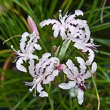 Nerine masoniorum is a species of flowering plant in the family Amaryllidaceae, subfamily Amaryllidoideae,[3] native to the eastern Cape Province of South Africa.[2] It is a bulbous perennial belonging to the group of nerines that have narrow evergreen foliage.[4] The thread-like leaves reach a length of 25 cm or more. The flowering stem is 15–25 cm tall, with up to 11 flowers arranged in an umbel. Each flower has six narrow pink tepals with wavy edges.[5] It flowers in late summer in cultivation, the first of the nerines to do so.[6] It has received the Royal Horticultural Society's Award of Garden Merit.[7]