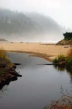 Neskowin Creek is a short stream near the coast of the U.S. State of Oregon. It flows generally west-northwest for about 10 miles (16 km)[3] from the west slope of Neskowin Ridge in the Northern Oregon Coast Range to the Pacific Ocean. Passing through parts of the Siuslaw National Forest in southern Tillamook County, it crosses under U.S. Route 101 (the Oregon Coast Highway) and flows parallel to it until reaching Neskowin Beach State Recreation Site and the community of Neskowin. Proposal Rock, a small island near the shore, is adjacent to the mouth of the creek. Named tributaries from source to mouth are Sutton Creek, which enters from the right, Kingdom Creek from the left, then Sloan, Lewis, Jim, Prospect, and Kiwanda creeks, all from the right.[2]