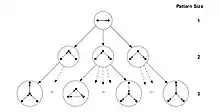 Schreiber and Schwöbbermeyer [12] proposed an algorithm named flexible pattern finder (FPF) for extracting frequent sub-graphs of an input network and implemented it in a system named Mavisto.[27] Their algorithm exploits the downward closure property which is applicable for frequency concepts F2 and F3. The downward closure property asserts that the frequency for sub-graphs decrease monotonically by increasing the size of sub-graphs; however, this property does not hold necessarily for frequency concept F1. FPF is based on a pattern tree (see figure) consisting of nodes that represents different graphs (or patterns), where the parent of each node is a sub-graph of its children nodes; in other words, the corresponding graph of each pattern tree's node is expanded by adding a new edge to the graph of its parent node.