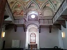The chapel is the oldest newly built protestant church in the world, although construction of the shell began as a catholic court chapel in 1537, with a small apse, in which the altar with a crucification group, commissioned in 1540, is placed. In 1541 elector Otto Henry converted to the new Lutheran protestantism, and from 1542 the Salzburg church painter Hans Bocksberger der Ältere lavishly decorated the chapel with painted ceiling vaults and galleries in the latest antique-style Italian manner. The picture program not only thematized the decisive role of Christ as divine guarantor of grace, the central lutheran doctrine. It also claims a decisive role of the prince in the distribution of this grace within a God-given earthly order. The court chapel was consecrated on 25 April 1543 by the reformed theologian Andreas Osiander. It was thus the first newly built protestant church, an honor often attributed to the court chapel of Hartenfels Castle at Torgau which was built in 1443-44 and consecrated by Martin Luther on 5 October 1544.