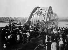 Following the opening of the railway bridge, pedestrian cross was facilitated by the new structure, while boats and canoes still constituted the main crossing for pedestrian and vehicle transportation.[18] As the population grew, by the 1930s the boat services became insufficient. After several complaints and stories published in the local press, Governor Carlos H. Rodríguez requested of the National Directorate of Roadways (Spanish: Dirección Nacional de Vialidad) the construction of a road bridge.[19] The structure was to be built next to the railway bridge, in the cross of the former herd wrangling path. The construction was assigned to the German-owned company GEOPÉ.[18] The cornerstone was laid on May 26, 1935, by the new governor, Enrique Raimundo Pilotto. The construction deadline was set for April 15, 1937.[19]