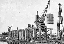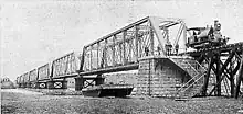 Krag arrived in September 1899 to survey the area to find the most suitable location to build the bridge. The findings of Krag were reported to the London consultants Livesey & Henderson that projected the construction of a structure of seven spans, each 52.2 metres (171 ft) long; and a 352-metre (1,155 ft) wooden trestle approach viaduct.[8] The steel sections, nuts, bolts and rivets were sent from Birmingham, United Kingdom. Unsuitable to be used for the abutment and foundations, the local rock and sand was replaced by material brought from Pichi Mahuida. A tide gauge was placed in Paso de los Indios, one of the headwaters of the Neuquén River to measure the changes on the water level. The telegraph office at Paso de los Indios would update mornings and nights the workers with the level of water expected at construction site within 24 to 30 hours. A second tide gaude at Chos Malal would alert the site 60 hours ahead of time.[9] During the construction, the workers camped in tents on the left bank, while during the summer they moved to nearby bulrush shacks.[10] The process marked the first use in Argentina of compressed air in construction, implemented to build the foundations with caissons.[11] A general store that received supplies from Ingeniero White twice a week was established for the workers to buy wares at low prices, while a cargo depot had to be built close to the construction site.[9]