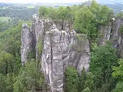 Neurathen Castle (German: Felsenburg Neurathen), which was first mentioned by this name in 1755,[1] is located near the famous Bastei rocks near Rathen in Saxon Switzerland in the German state of Saxony.[2] This was once the largest rock castle in the region, but today only the rooms carved out of the rock, passages, the cistern and the beam supports of the former wooden superstructure have survived.[3][4] In the years 1982–1984 parts of the extensive castle were used to build the open-air museum.