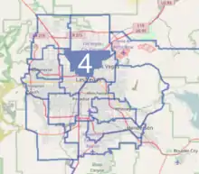 The 4th district was created during the reapportionment of the districts in 2011 after the 2010 Census was held.[19] The new districts went into effect on January 1, 2012 for filing for office and nominating and electing senators. It became effective for all other purposes on November 7 – the day after Election Day, when the new senator terms began. The borders of District 4 are defined in the Nevada Revised Statutes using census tracts, block groups, and blocks.[20] In the 1960s, the 4th district was a multi-member constituency that covered the entirety of Clark County. Since the 1970 census, it has been based around the Las Vegas Historic West Side and southern North Las Vegas.