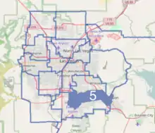 District 5 came into existence in 2012 after the senate districts were redistricted as a result of the 2010 Census.[18] The new districts went into effect for filing for office, and for nominating and electing senators on January 1, 2012, and for all other purposes on November 7 – the day after Election Day, when the new senator terms began. In the Nevada Revised Statutes, the area of the 5th district is defined using census tracts, block groups, and blocks.[19]