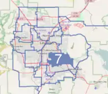 The present 7th district was drawn during the reapportionment of the districts in 2011 after the 2010 Census.[16] The newly drawn districts became effective for filing for office, and for nominating and electing senators on January 1, 2012, and for all other purposes on November 7 – the day after Election Day, when the new senator terms began. The area of District 7 is defined in the Nevada Revised Statutes using census tracts, block groups, and blocks.[17]