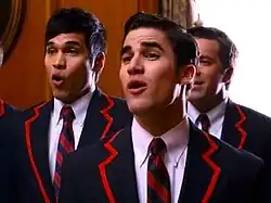 The episode introduced Criss as Blaine, a gay member of a rival glee club, the Dalton Academy Warblers.[5] In September 2010, a casting call was released for an actor to portray a "cute, charismatic, gay high school junior" who would lead a competing glee club.[6] Criss had auditioned for Glee several times before, once for the role of Finn Hudson. The character breakdown for Blaine was the first he believed he had a chance of securing, and indeed his audition was successful.[7] Blaine was introduced primarily as a mentor to Kurt. Criss explained, "At this point, Kurt's [sexuality] has been such a sense of discord in his life. Blaine finds [being gay] empowering. He embraces who he is, and sees Kurt [struggling with] the same things that he had to deal with, and I think he wants to impart that knowledge."[8] Murphy described Blaine as a character with "great self-loathing" and regret for having run away from his own tormentors; he intended this to form part of his story arc for the season, as Blaine tries to set right some past mistakes.[4] Neither he nor Criss knew whether Blaine would eventually become Kurt's boyfriend[8][9]—a role originally intended for new club member Sam Evans (Chord Overstreet) until the producers decided to change Sam to heterosexual and paired him with Quinn[10]—but based on the characters' chemistry and the "immediate outcry" from fans who wanted to see them as a couple, Murphy later decided to pair them romantically.[11]