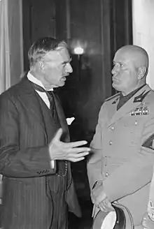 As part of his policy to reduce the number of potential enemies, Chamberlain greatly stressed the use of the Gentlemen's Agreement in January 1937 as the basis of winning Italy back to the Western fold.[23] Chamberlain believed that Italy and Germany were tied together by the Spanish Civil War and that if Italian Prime Minister Benito Mussolini could be persuaded to withdraw his troops from Spain, Italy would orbit back to the Stresa Front. In the summer of 1937, Chamberlain started to use Sir Joseph Ball of the Conservative Party Research Department and the Maltese lawyer Adrian Dingli to contact Italian Foreign Minister Galeazzo Ciano to circumvent the Foreign Office and Foreign Secretary Anthony Eden since they were less enthusiastic on the prospects of winning back Italy.[23] The prospect of talks was interrupted in August 1937 by Italian submarine attacks on neutral ships carrying supplies for the Spanish Republic.[23]