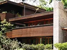 Designed for a couple soon after Gruzman's Japan trip, ideas of traditional Japanese architecture are infused in the design. Such as the entry to the pagoda-like end of the house and a sweeping curved roof suspended by cables.[14] It is one of the early houses in Sydney to use materials such as dark stained timbers and natural brick.The house is located at The Quarterdeck, 17 North Arm Road.[1]