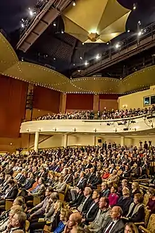 In 2004, the Foundation led the effort to build and endow a performing arts center in New Albany’s historic village center, the Jeanne B. McCoy Community Center for the Arts, adjacent to the public school campus.[25] The Foundation united the village and township governments, the school district, the community authority, and private benefactors, to create an arts venue serving both the schools and the community.[26][20] Playwright Wendy Wasserstein spoke at a 2004 fundraiser that raised $2.23 million for the future arts center. Moved by the community’s commitment to arts and education, Wasserstein said, "This is extraordinary… There is nothing like creating the strength of a community. It’s the most humane thing you can do."[27] The $13 million Jeanne B. McCoy Community Center for the Arts, known as "The McCoy," opened in 2008.[28] The center presents hundreds of events and performances annually, and is home to the 100-member New Albany Symphony Orchestra.[29] In 2019, The McCoy hosted a total of 374 events and welcomed 102,401 attendees, counting both students and community members.[1] The Foundation also established The McCoy's $7 million endowment.[9]