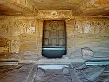 The Temple of Derr or el-Derr is a speos or rock-cut Egyptian temple, originally in Lower Nubia. It was built during the 19th Dynasty by Pharaoh Ramesses II.[6] It is the only rock-cut temple in Nubia, which was constructed by this pharaoh on the right (or east) bank of the Nile and used to stand at el-Derr.[7] The temple's unique position "was probably because the river on its approach to the Korosko bend flows in an 'unnatural' southeasterly direction."[8] The Derr structure was known in ancient times as 'The Temple of Ri'amsese-meryamun [Ramesses II] in the Domain of Re '[9] and was dedicated to the god Ra-Horakhty.[10] Scholars disagree over its precise construction date: the French Egyptologist Nicolas Grimal states that it was built in the thirtieth year of Ramesses II, presumably to coincide with his first royal jubilee.[11] John Baines and Jaromír Málek also write that the temple of Derr "was built in the second half of the king's reign", likely because its "plan and decoration resembles the Great Temple of Abu Simbel (minus the colossal seated statues against the facade)."[12] Abu Simbel was built between Year 24 and Year 31 of Ramesses' reign.[13] According to Joyce Tyldesley, the Temple of Derr was built by Setau, who is known to have served as Ramesses' Viceroy of Kush or Nubia between Year 38 to 63 of this pharaoh's reign.[14]