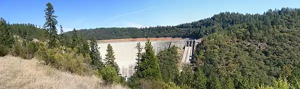New Bullards Bar Dam is a variable radius concrete arch dam constructed in the early 1960s in California on the North Yuba River. Located near the town of Dobbins in Yuba County, the dam forms the New Bullards Bar Reservoir, which can hold about 969,600 acre⋅ft (1.1960×109 m3) of water. The dam serves for irrigation, drinking water and hydroelectric power generation.
