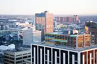 Completed in 1968, New Cambridge Lofts was designed by architectural firm Richards Berretti Jellenick, in the style of modern architecture. As an office building, New Cambridge Lofts was the corporate home of some of the city's largest law firms, and a large high-end restaurant and bar called Churchills.[1] The existing tower is only one-half of the architects' original plan; another matching tower was supposed to be constructed to the east of the Cambridge, but was never completed.[2]