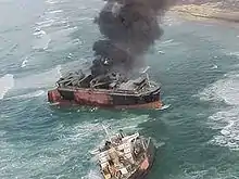 Since the vessel was no longer seaworthy and could not move under its own power, even if freed from the beach, the focus of the operation changed. Oil from the ship's fuel tanks continued to pose an environmental hazard, a situation exacerbated by both the ship's structural failure and continuing pounding from the surf. In order to mitigate the damage the Unified Command decided to set the fuel tanks on fire in order to burn off the oil. The first attempt was made on 10 February. Napalm and other incendiary devices were used to ignite the fuel, but only one of the diesel tanks was burned effectively. A second attempt was made on 11 February when US Navy explosive experts placed 39 shaped charges to breach the top of the fuel tanks from within the cargo holds. 602 U.S. gallons (2,280 L) of napalm and nearly 397 pounds (180 kg) of plastic explosives were also used to ignite the fuel on board. The ship burned for approximately 33 hours.[12] Additional smaller-scale attempts were made to burn more oil over the next two days, with limited success. The total amount of oil that was burned is estimated to be between 165,000 and 255,000 US gallons (620 and 970 m3).[12] The structural stress caused by the fire, combined with continued severe weather, caused the vessel to break into two sections around midnight on 11 February.
