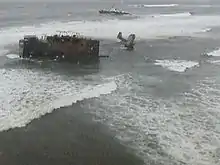 A project to remove the stern by dismantling it on the beach was started in June 2008, after Oregon legislative approval.[18] The dismantling, expected to cost US$18 million, was approved by the State Legislative Emergency Board in September 2006.[19] The move was originally scheduled for 2007, but delays in the negotiations pushed the project back a year. Due to weather and surf conditions, the project had to be undertaken during the spring and summer months.[19] Titan Maritime Company, a subsidiary of Crowley Maritime Corporation, signed a US$16.4 million contract with the Oregon Department of State Lands.[15][20] Titan Maritime used large jackup barges, Karlissa A and Karlissa B, for the New Carissa dismantling project. Once the barges were in place, a cable car system was installed to allow the crews and their equipment access to the barges from the beach.[18] The barges allowed the crews to access the wreck from 40 feet (12 m) above the surf.[18] The crews cut New Carissa into removable pieces and then lifted them to the barges with cranes.[17] The cutting portion of Titan's plan was largely completed by 31 July 2008, and the company then focused on pulling the stern from the sand, a process that was measured in inches.[21][22] The project's managing director expressed confidence that the removal deadline of 1 October 2008 would be met.[18][23] By September 2008, Titan had successfully removed the majority of the wreck; no part of the ship was visible from above the water and only a few small pieces remained submerged.[24] Karlissa A and Karlissa B were relocated on 12 October 2008, and Titan's shore operations were completely removed by November 2008.[25]