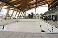 The facility's entrance is connected to the main road by a vehicle ramp while pedestrians including persons with disabilities can access the stadium through its side entry points.[12] The lower ground floor hosts parking spaces for 26 cars and ten buses.[6]