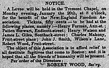 The New England Freedom Association was founded in 1842[1] or 1843,[2] and existed for about five years. Its founding members included William Cooper Nell, Henry Weeden, Judith Smith, Mary L. Armstead, Thomas Cummings, and Robert Wood. They raised "funds to aid those of our friends who flee to the land of the Pilgrims for their liberty."[2] Meetings were held in the African Meeting House on Beacon Hill.[3]