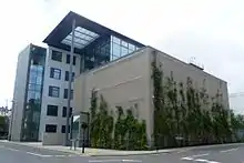 Blocks L and M (total ground space 5,509 square metres (59,300 sq ft)) consist of accommodation for Study Group International, housing Bellerbys College, a preparatory college for foreign students intending to go to British universities; Embassy CES, a language school; Study Group head offices; and residential accommodation for students.[50][51] The buildings contain four floors of teaching space, including 62 classrooms, a library and a bookshop (total area 4,336 square metres (46,670 sq ft)); five floors of accommodation (7,046 square metres (75,840 sq ft)) for approximately 375 students; a canteen and catering area (701 square metres (7,550 sq ft)); and offices and college administration space (1,965 square metres (21,150 sq ft)).[52] There are 60 car parking spaces available beneath Block L for staff. The two blocks are connected by an enclosed glass walkway.[53] An early version of the master plan showed three separate buildings on the site; the third, "Block N", was incorporated within the Block M building instead at the request of the college.[50]