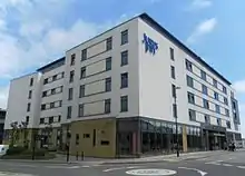Block K was acquired by the Jurys Doyle Hotel Group PLC, which operated hotels under the "Jurys Inn" brand until it sold its portfolio in 2007. It houses a three-star hotel, built over five and six storeys, as well as offices and public space. It has a floor area of 10,518 square metres (113,210 sq ft), and there are 234 bedrooms, various meeting rooms and similar facilities.[34][43] The hotel was built by Northern Irish construction group McAleer & Rushe.[44] It opened in late 2007.[45]