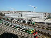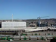 Looking over the Brighton Main Line towards the site of the former locomotive works. Left to right: Blocks L and M (under sheeting); the new station car park; Blocks E and F (beneath the blue crane)