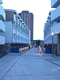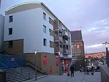 This is another mixed-use block, with a training centre at street level. The residential element within the 3,953 square metres (42,550 sq ft) area consists of 56 units: eight one-bedroom flats, two one-bedroom duplexes, 34 two-bedroom flats and 12 three-bedroom flats. Most of the building is five storeys high (the lowest floor being the training centre, with four residential floors above), but a further three storeys are incorporated within a tower in one corner. Again, no parking is allocated to this block.[26]
