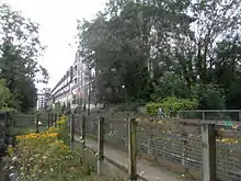 Part of the site, below and to the east of Block G, consists of a stretch of disused railway track which has for some time been designated a Site of Special Nature Conservation Importance (SNCI).[61] This is defined as a "locally important site of nature conservation adopted by local authorities for planning purposes".[62] This will be maintained and improved to create a "green corridor" called the Greenway, which will run from the embankment overlooking New England Road, at the northernmost point of the site (beyond Blocks L and M), through to the station. The northern section, which is already partly wooded and home to a variety of wildlife, will be maintained in this condition.