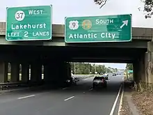 Route 37 features a cloverleaf interchange with the Garden State Parkway/US 9. Past the Garden State Parkway, the route crosses the former alignment of US 9, Route 166.[1] Past this intersection, Route 37 becomes a road lined with several businesses.[2] The route intersects CR 549 (Hooper Avenue) and CR 38 (Clifton Avenue). CR 627 (Vaughn Avenue/West End Avenue) intersects next and Route 37 runs along the border between Toms River to the north and Island Heights to the south.[1] Route 37 meets the southern terminus of CR 627 (Central Avenue) and fully enters Toms River Township again at the Gilford Avenue intersection. Further east, the route intersects CR 549 Spur/CR 571 (Fischer Boulevard).[1]