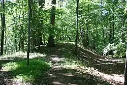 Some remains can be found east of Glen Avenue. First the curving southern end of Woodcrest Avenue follows the NJWL alignment, and this curve continues to a dry-stone wall that can be seen on the west side of Brookside Drive (park in the dirt space on the east side of the road to view it). From here a timber trestle was constructed across the valley that was known as the Ghost Bridge (shown here ) since no track was ever laid on it. East of the river, the graded right of way can still be seen inside the South Mountain Reservation. It starts as an embankment and continues into a wide cut, passing the site of an old quarry, continuing past the present-day parking lot opposite Lackawanna Place, and continuing straight to Glen Avenue, and onward as a property line to the Morris and Essex tracks. The part from the quarry to the M&E had track laid for some decades into the early 20th century as a freight siding serving the quarry, so it is well preserved.
