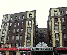 Aesthetically, the New Law coincided with the fashion for Beaux-Arts architecture. The fanciful sandstone faces, gargoyles and filigreed terracotta of the previous twenty years of tenement design gave way to the more abstractly classical, but extremely florid ornamentation of this historically informed and integrated, urbane, international and more grandiose Parisian style.[1] Unlike the flat street wall of previous tenements, which maximized the space available to tenants, the street wall façade of the New Law tenement often features recessed indentations, sometimes curved, sometimes rectilinear, giving the impression that stylish appearance mattered to the designer and owner more than optimizing space. They also feature oval and arched windows—more expensive to produce and replace—heavy terracotta ornaments around the windows and often thin brick, again, more expensive to manufacture and to lay. They give an impression of opulence which belies their purpose, location and their inhabitants; many were built in the ghetto to make money on the housing of largely impoverished immigrants by packing several families into small apartments.[2]