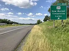The main highway providing access to New Market is Interstate 81. Within the town limits, I-81 has a junction with U.S. Route 211 and Virginia State Route 211, which head east to Luray and west to Timberville, respectively. U.S. Route 11 also passes through New Market, serving as the main street through the town and as a local service road to I-81.