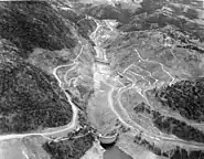 Actual construction began in July 1966 with clearing of the dam and reservoir site, construction of access roads, foundation preparations and excavations for the future outlet works. A diversion tunnel to allow the river to bypass the dam site was excavated between 1966 and December 1973.[9] The Corps opened bids for construction of the main dam on October 10, 1972. Melones Contractors (a consortium formed by Guy F. Atckinson Company, Gordon H. Ball, and Arundel Corp.) won the primary construction contract for $109.7 million, while Allis-Chalmers and General Electric took an $11.5 million contract to provide turbines and hydroelectric generating equipment.[32] During reservoir clearing operations, the USACE spent about $28 million relocating roads and bridges in the future reservoir space.[32] Foundation work for the dam itself began on March 6, 1974 with the first embankment material placed in January 1976.[32] Much of the embankment fill came from an excavation shortly northwest of the dam, which would later serve as the dam's spillway. During the height of construction in the summer, the total workforce reached about 800, while averaging between 500–600 in the winter months.[33]