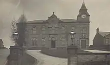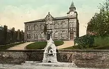 The middle to late nineteenth century was a period in which several public buildings were built in the town, including banks, halls, schools, and many Co-operative shops.[1] The Mechanics' Institute of New Mills first suggested the building of a public hall in 1859 when it needed more space. It took twelve years to raise the money, entirely by public subscription, to buy the land and begin the building. Its opening ceremony took place on 9 September 1871, with the hall opened by the Duke of Devonshire. It had a multitude of uses, including public and private events, exhibitions, meetings, county courts, Local Board offices, as well as the reading rooms of the Mechanics' Institute.[2] It was extended in 1875 to include a clock tower, and again in 1899 with the construction of a Carnegie free library to its rear (replaced by the larger present one in 1910), making New Mills one of the smallest towns in Derbyshire to operate one.[3] The clock is made by Potts of Leeds; its original chimes were replaced in 1939.[2]