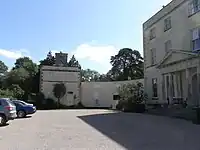 The house consists of a central stuccoed block of three floors with a basement divided into five bays, with a flanking pavilion of two stories in four bays, to either side connected by low flanking quadrant walls. In the centre of the front is a large classical pedimented portico fronted by four Ionic columns. The flanking walls screen the service wings behind. The rear elevation has on either side full-height semi-circular bays. The interior contains much Adam style decorative plasterwork, apparently the work of a certain Mr Powell referred to in the invoice from the builder Bellman,[26] and ornamental fittings. Robert Adam did much work for the Parkers at Saltram House near Plymouth between 1768–72 and 1779–82.[27] The Poles are likely to have been guests at their neighbours at this time, but in any case as they also spent much time in London at their house in Bedford Square, they would have been familiar with Adam's work in London and elsewhere. The north-east pavilion contains a theatre of c. 1900.[28] The top floor housed the servants' quarters.[29] The kitchens were originally situated in the left hand pavilion, later converted into a theatre.[30] A large Palladian style stables block is situated around a semi-circular courtyard, several hundred yards from the house, now converted into several separate residences. It had stabling for twelve horses and accommodation for grooms.