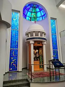![]() The Torah ark, stained glass windows and dome of the New Synagogue | |