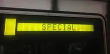 Special is a signifier for a train that is running along a nonstandard route. It is sometimes used for special holiday trains,[7][8] baseball game service,[9] or for emergency or custom routes. Most trains have a "Special" option on the rollsigns or LCD/LED displays.[10]