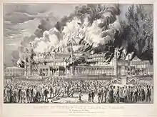 The New York Crystal Palace was destroyed by fire on October 5, 1858, during the American Institute Fair held there. The fire began in a lumber room on the side adjacent to 42nd Street. Within fifteen minutes its dome fell and in twenty-five minutes the entire structure had burned to the ground. There were no deaths but the loss of property amounted to more than $350,000. This included the building, valued at $125,000, and exhibits and valuable statuary remaining from the World's Fair.[6]