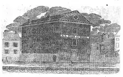 The boys' building was sold to the Society of Mechanics and Tradesmen, which moved its headquarters and school on Chambers Street to the new location.[2] During a cholera outbreak in 1832, the building was used as a hospital.[7][8] In 1845, the Society purchased an adjoining narrow lot fronting Broadway, upon which it built the entrance corridor of what became Mechanic's Hall, a popular home for minstrel performances, with the former high school lot serving as the performance space. The Society held onto the original high school property and Broadway-linking plot until 1945.[9]
