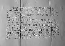 New York Point (New York Point: ) is a braille-like system of tactile writing for the blind invented by William Bell Wait (1839–1916), a teacher in the New York Institute for the Education of the Blind. The system used one to four pairs of points set side by side, each containing one or two dots. (Letters of one through four pairs, each with two dots, would be : :: ::: ::::.) The most common letters are written with the fewest points, a strategy also employed by the competing American Braille.
