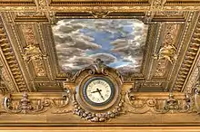 In May 2014, one of the rosettes in the ceiling of the Rose Main Reading Room fell to the floor.[158] The NYPL closed the Rose Main Reading Room and the Public Catalog Room for renovations. The $12 million restoration project included restoring the rosettes and supporting them with steel cables, as well as installing LED lamp fixtures.[159] The NYPL commissioned EverGreene Architectural Arts to recreate the mural in the Bill Blass Public Catalog Room, which had been severely damaged during its 105-year history.[160] The NYPL also replaced its historic chain-and-lift book conveyor system with a new delivery system using "book trains".[130] The restored Rose Main Reading Room and Bill Blass Public Catalog Room reopened on October 5, 2016.[161][162] Starting in August 2017, the Main Branch hosted an interim circulating library at 42nd Street,[163] housing part of the Mid-Manhattan Branch's collection while that building was closed for renovations.[164] The Mid-Manhattan Branch's collection of pictures was also temporarily relocated to the Main Branch[165] until the circulating library reopened in 2020.[166][167]