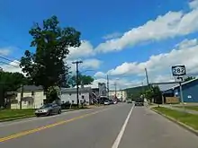 NY 282 begins at the Pennsylvania state line in the town of Nichols, where it connects to PA 187. The route heads to the northwest as a two-lane road, loosely paralleling Wappasening Creek as it passes farmland in the base of a valley surrounding the creek. It crosses over the creek and serves little more than farms on its way into the village of Nichols, where the open fields give way to residential neighborhoods and NY 282 becomes known as Main Street. After two blocks, the highway enters Nichols' central business district, where it intersects with County Route 6 (CR 6, named River Street),[3] a highway once designated as NY 283.[4] NY 282 turns west at the junction, following West River Street through another residential section of the village to Nichols' western village limits, where the street name changes to West River Road.[3]