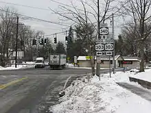 Just 0.11 miles (0.18 km) northwest of Ferdon Avenue, the route briefly enters the village of Piermont, where it remains locally maintained.[6] Here, it indirectly connects to US 9W northbound.[5] Outside of the village limits, NYSDOT resumes maintenance of the highway[6] as it traverses areas more commercial and educational in nature. Along this last stretch, NY 340 passes St. Thomas Aquinas College before intersecting NY 303 near the hamlet of Orangeburg. This junction serves as the northern terminus of NY 340;[5] however, the route officially continued for another 0.07 miles (0.11 km) to a 90-degree turn where Orangeburg Road (NY 340) becomes Greenbush Road.[1] One block north of this point is the eastern terminus of CR 20, which provides access to the PIP from NY 303 and NY 340.[5] It was truncated to end at NY 303 by 2017.[4]