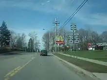 NY 438 begins at an intersection with US 62 and NY 39 in northern Gowanda. The route heads north, inheriting the Buffalo Street moniker from US 62 and NY 39, which turn east at NY 438's southern terminus. Outside of the village in Collins, the route becomes Four Mile Level Road as it curves westward into the Cattaraugus Indian Reservation.[4] As its name implies, the route traverses relatively level terrain for a stretch of roughly 4 miles (6 km) as it parallels the northern bank of Cattaraugus Creek to the northwest and west.[5][6] During this stretch, NY 438 intersects both Versailles–Plank Road and Brant Road (southern terminus of County Route 9 or CR 9) and crosses over the narrow Clear Creek.[4]