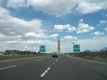 The Ocean Parkway begins at a cloverleaf interchange with the southern terminus of the Meadowbrook State Parkway and the Bay Parkway in Jones Beach State Park. Proceeding eastward, the Ocean Parkway parallels the Bay Parkway through Jones Beach State Park, running along the beachfront and past multiple recreational facilities. Just after a connection to the Bay Parkway, the four-lane parkway passes a parking lot for Jones Beach, along with a turnoff into a secondary lot for the bathhouse and the Jones Beach Theatre. In front of that turnoff, the westbound lanes pass two ramps that lead to a large parking lot that spans the gap between the Ocean and Bay parkways. After the parking lot, the Ocean Parkway enters a roundabout around the Jones Beach Water Tower (locally known as "The Pencil"), marking the southern terminus of the Wantagh State Parkway.[2][3]