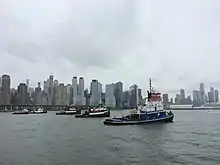 The New York Tugboat Race is a contest for working tugboats held on the Hudson River every Fall on the Sunday before Labor day. It was founded in part by Captain Jerry Roberts, who also serves as its chief announcer.[1] Boats race one nautical mile from 79th Street to Pier 84 at 44th Street in Manhattan. The race is the occasion for a dockside festival.[1] Events currently include nose-to-nose pushing competitions, a line toss competition, and best mascot/costume contests between the crews.[2] After the award, the spectators of the race can compete in events that include a knot tying competition, an on land line toss competition and a spinach eating competition. The spinach eating competition is in honor of the Popeye the sailor cartoon character. Spectators can also pay to get a seat on a tug boat during the events.[3]